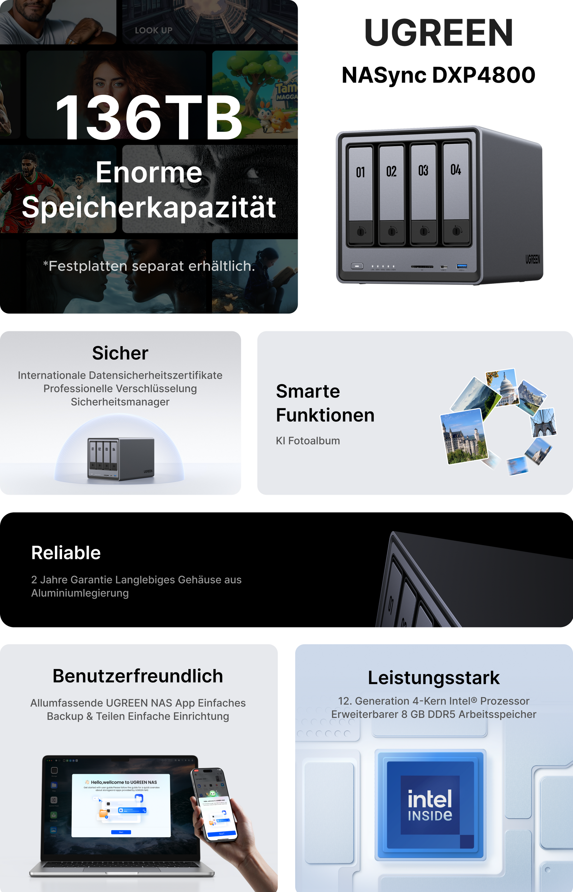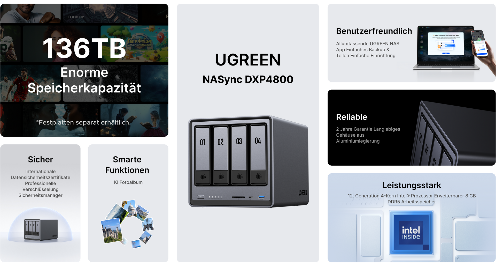- 4-Bay, massiver Datenspeicher: Ausgestattet mit vier SATA- und zwei M.2-NVMe-Laufwerksschächten bietet das NASync DXP4800 eine maximale Speicherkapazität von bis zu 136 TB.
