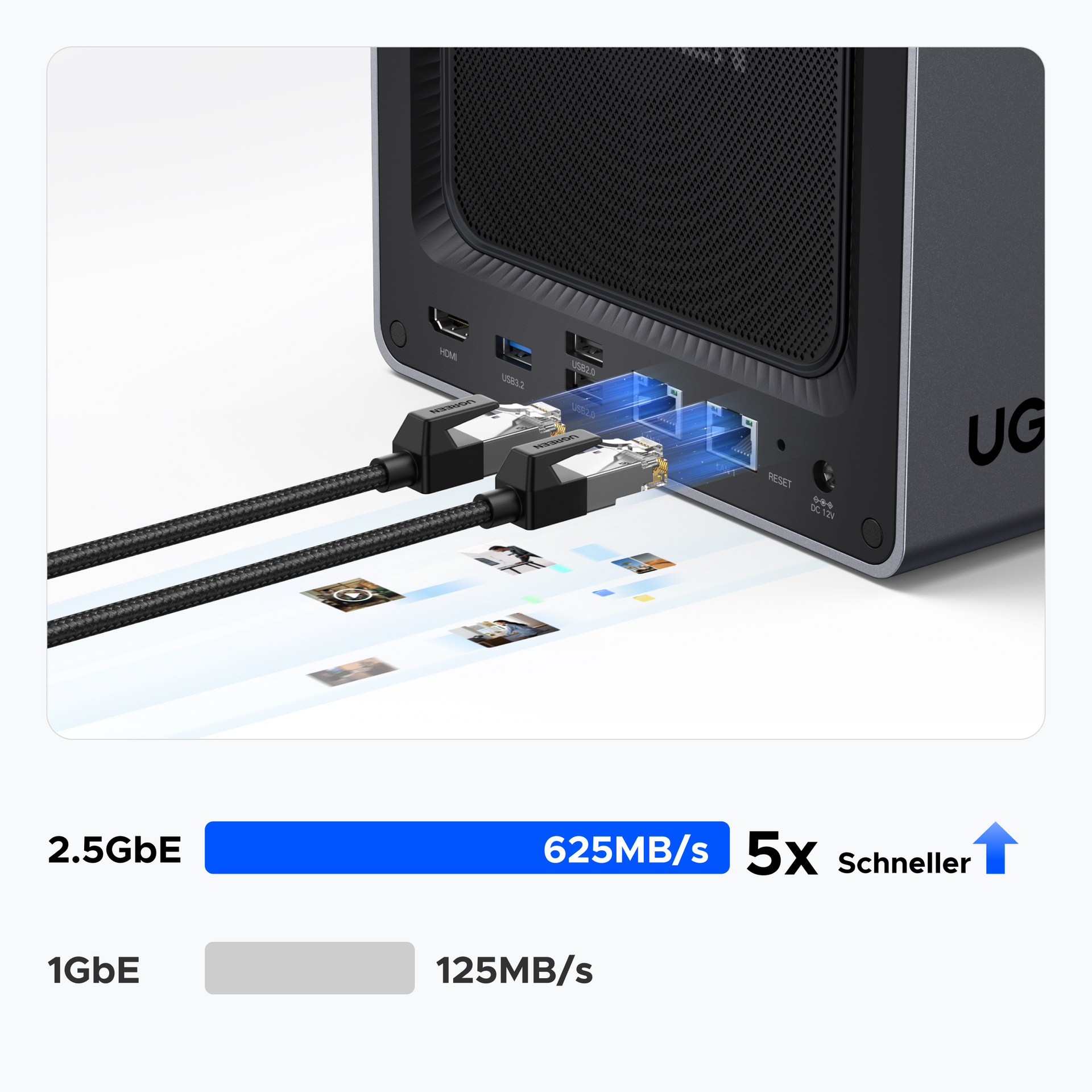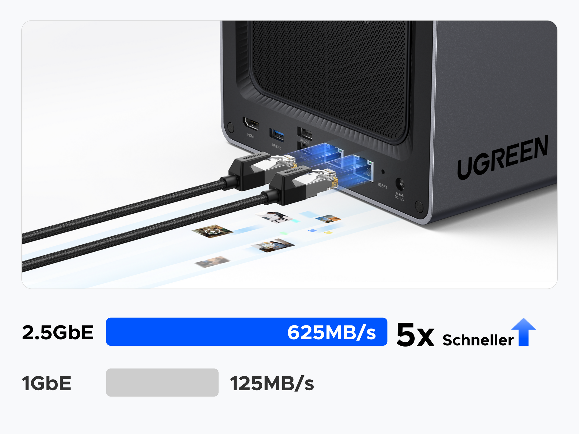 Dank 2x 2,5GbE-Anschlüssen überträgt das System mit bis zu 625 MB/s – ein 1GB-Backup dauert unter 2 Sekunden (5x schneller als 1GbE).