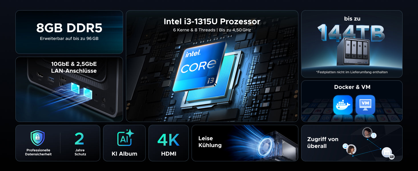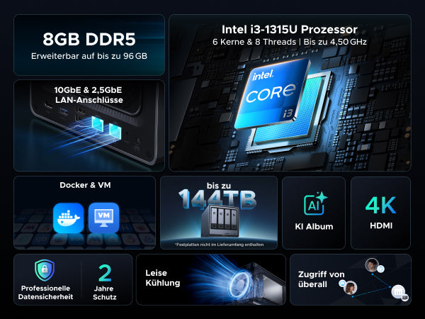 - Intel Core i3-1315U Prozessor: 6 Kerne, 8 Threads, bis zu 4,5 GHz Turbo. Bietet mehr Leistungsspielraum als Einsteiger-NAS für flüssigeres Multitasking und anspruchsvollere Workloads.