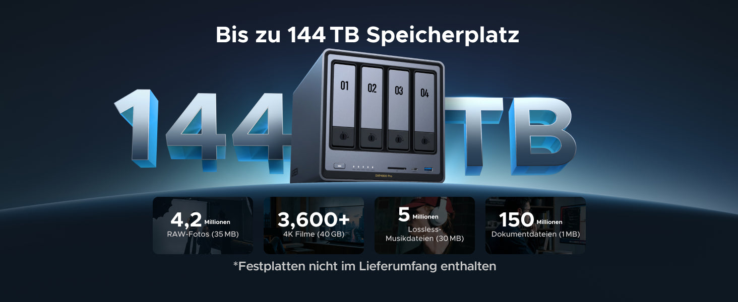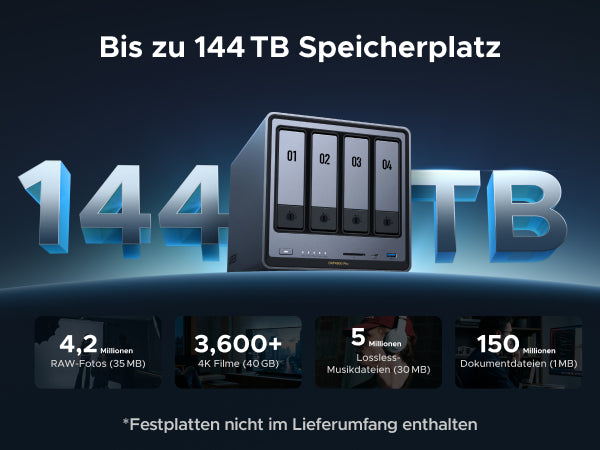 - Bis zu 144 TB Speicher: Stellen Sie alles sicher: Bis zu 47 Millionen 3-MB-Fotos, 142 Millionen 1-MB-Dokumente oder 92.000 1,5-GB-Videos finden hier Platz.